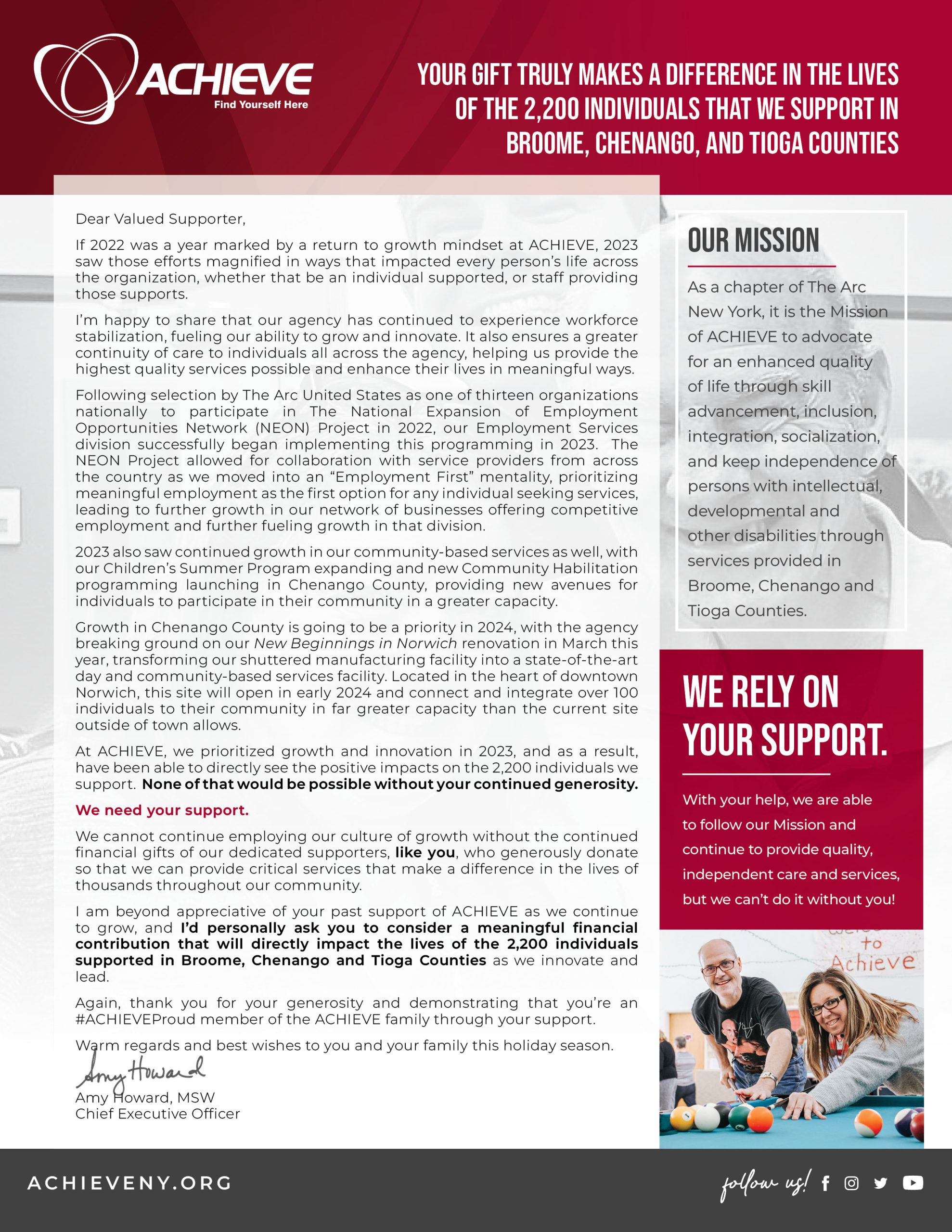Annual Appeal Donation Recognition Levels Founder’s Circle$5,000 & above Director’s Circle$2,500 – $4,999 Leader’s Circle$1,000 – $2,499 Partner$500 – $999 Patron$250 – $499 Sustainer$100 – $249 Supporter$1 – 99 Donation Form Name First Last Address Street Address Address Line 2 City AlabamaAlaskaAmerican SamoaArizonaArkansasCaliforniaColoradoConnecticutDelawareDistrict of ColumbiaFloridaGeorgiaGuamHawaiiIdahoIllinoisIndianaIowaKansasKentuckyLouisianaMaineMarylandMassachusettsMichiganMinnesotaMississippiMissouriMontanaNebraskaNevadaNew HampshireNew JerseyNew MexicoNew YorkNorth CarolinaNorth DakotaNorthern Mariana IslandsOhioOklahomaOregonPennsylvaniaPuerto RicoRhode IslandSouth CarolinaSouth DakotaTennesseeTexasUtahU.S. Virgin IslandsVermontVirginiaWashingtonWest VirginiaWisconsinWyomingArmed Forces AmericasArmed Forces EuropeArmed Forces Pacific State ZIP Code Email I / We would like to make a donation that will be used to benefit individuals with intellectual, developmental and other disabilities in the amount of Donation Type* One Time Recurring (monthly) This gift is in memory of:This gift is in honor of:Please send an acknowledgment card to:Other I would like information on how to remember ACHIEVE in my will or to give to the endowment. I would like information about ACHIEVE and opportunities of giving and service. I would like a tour. I would like a presentation to my church or club. Your gift to the 2024 Annual Appeal automatically renews your membership with ACHIEVE, allowing us to continue to advocate for individuals with intellectual, developmental and other disabilities. If you would prefer to opt-out of being a member of our organization, please check the box. Yes Total $0.00 Credit Card American ExpressDiscoverMasterCardVisaSupported Credit Cards: American Express, Discover, MasterCard, Visa Card Number Month010203040506070809101112 Year20252026202720282029203020312032203320342035203620372038203920402041204220432044 Expiration Date Security Code Cardholder Name CAPTCHA Δ Upon request, a copy of the latest annual report can be obtained from the organization, or from the Office of the Attorney General, by writing the Charities Bureau, 120 Broadway, New York, NY 10271